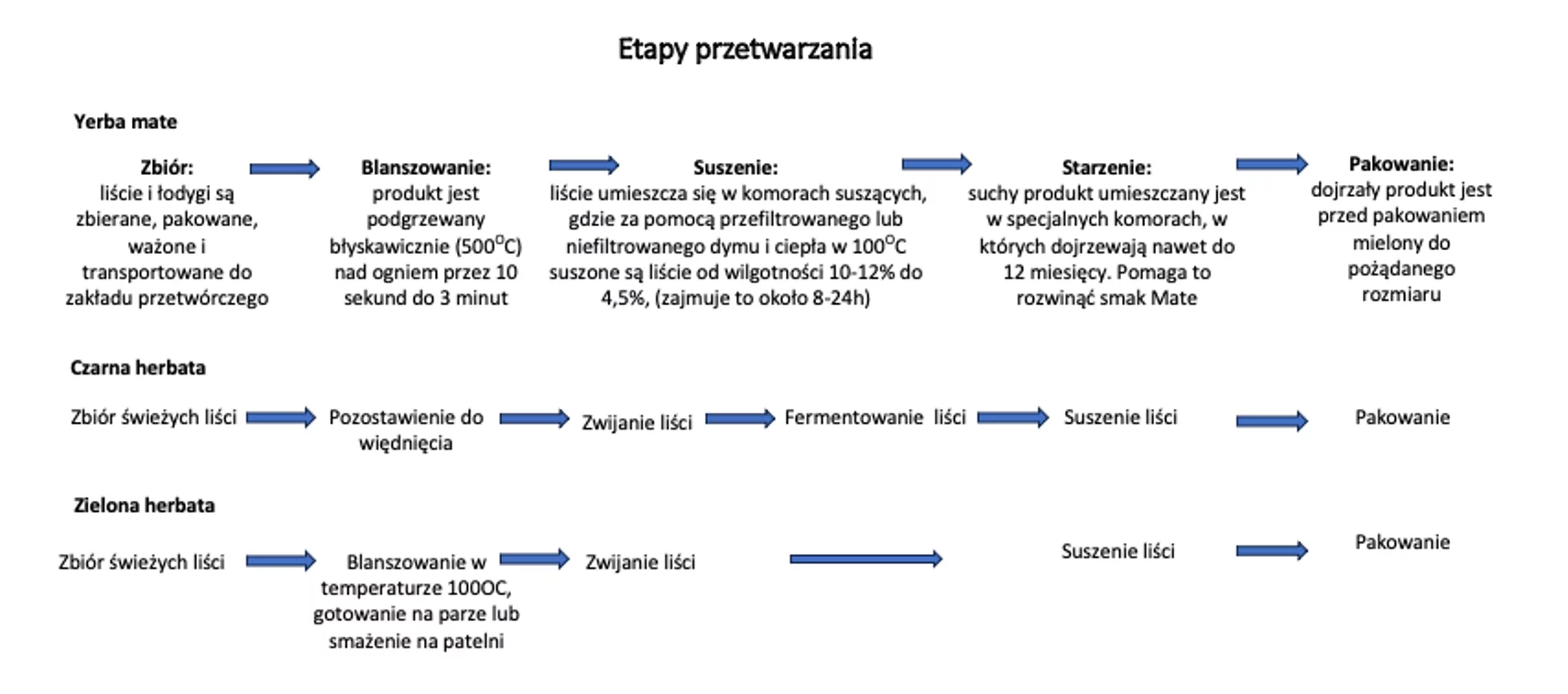 Na przetwarzanie Yerba mate, czarnej herbaty i zielonej herbaty składa się kilka etapów. Zarówno zebrane liście Ilex paraquariensis i zielonej herbaty w odróżnieniu do herbaty czarnej są poddawane blanszowaniu. Proces blanszowania polega na gwałtownym pogrzaniu w wysokiej temperaturze a następnie ochłodzeniu surowca. Pod katem chemicznym dochodzi do dezaktywacji działania enzymu – oksydazy polifenolowej. Oksydaza polifenolowa (jak nazwa wskazuje przedrostek „oksy”, z lac. oxygenium, inaczej tlen) utlenia polifenole. Proces ten wpływa na właściwości chemiczne i biologiczne surowca.